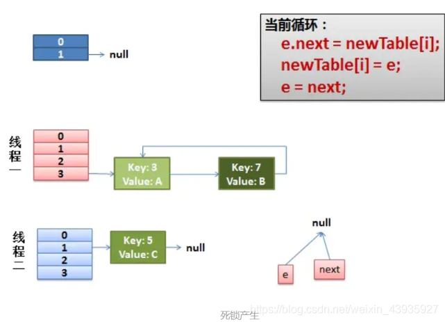 死锁产生原因:三次循环后成环,新槽点上的两个节点 A.next = B && B.next = A
