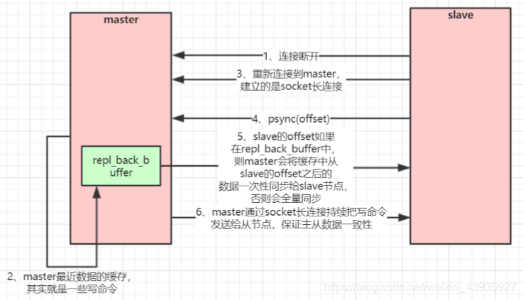 因此,当网络连接断开后,slave 会请求master 继续进行未完成的复制,从所记录的数据下标开始。如果 master 进程 id 变化了,或者从节点数据下标 offset太旧,已经不在 master 的缓存队列里了,那么将会进行一次全量数据的复制。从2.8版本开始,redis 改用可以支持部分数据复制的命令PSYNC去master同步数据。