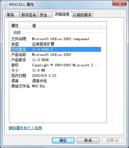 本实验正确的mso.dll版本为11.0.5606.0(默认路径C:\Program Files\CommonFiles\Microsoft Shared\office11\mso.dll,文件的MD5值为:251c11444f614de5fa47ecf7275e7bf1),mso.dll文件版本如图2所示。