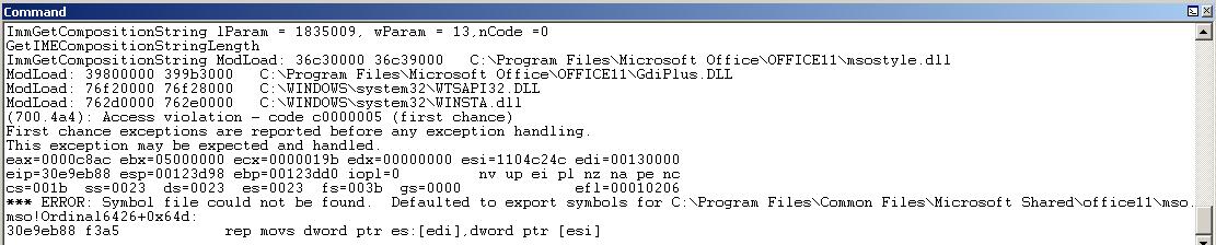 exploit打开Word,使用WinDbg附加Word进程,然后使用Word打开msf_crash.rtf文件,触发异常,程序断在0x30e9eb88,如图3所示,此时查看调用栈发现已被破坏。