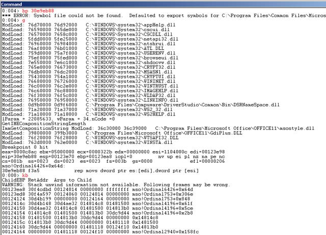 再次重启Word,在0x30e9eb88处下断点,然后断下后,查看调用栈,如图4所示。