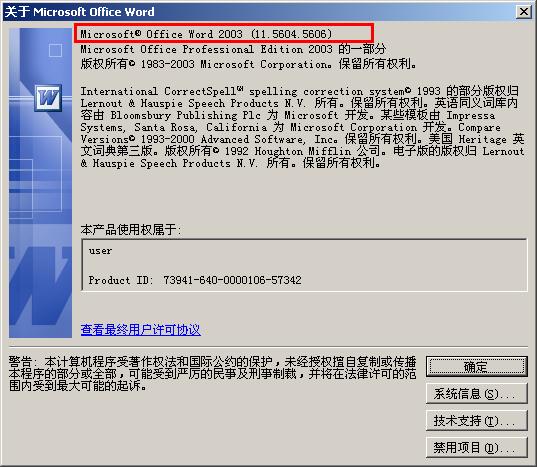 Microsoft Office产品的版本号使用下面的形式:aa.bbbb.cccc。此数字代表三个项目:aa:Office的版本:11即2003;12即2007;14即2010。