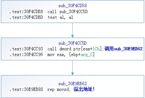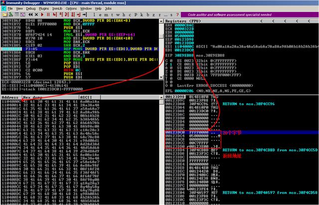 其中esi指向的位置为缓冲区开始位置;edi指向的位置为0x00233DC0,距离函数sub_30F4CC5D返回地址为20个字节。