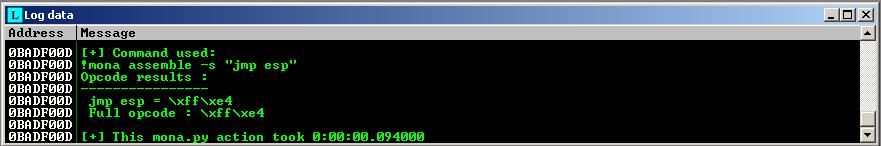 0BADF00D 0x3b030000 | 0x3b0d9000 | 0x000a9000 | False | False | False | False | True | 6.0.0.2527 [IMS**0A.IME] (C:\WINDOWS\system32\IMS**0A.IME)使用!mona assemble -s “jmp esp”命令生成jmp esp的机器码,机器码为\\xff\\xe4,如图12所示。