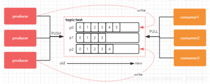 每个topic可以有多个生产者向它发送消息,也可以有多个消费者去消费其中的消息